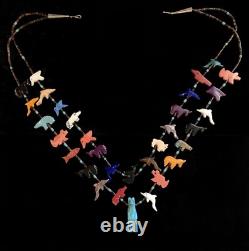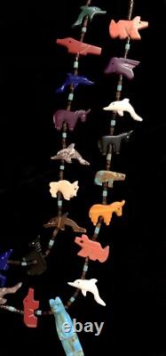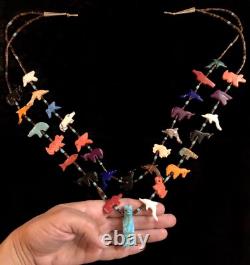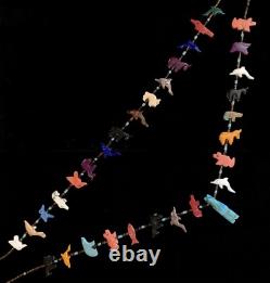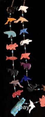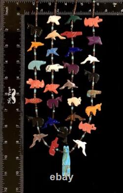 Beautiful Two Strand Carved Fetish Necklace. There are a total of 32 animal fetishes, including the adorable large Copper Turquoise Bear at the bottom! They are in a wide variety of gemstones. Including Copper Turquoise, Jet, Lapis, Sugilite, Malachite, Coral, Gaspeite, Howlite, Carnelian, Sodalite, Calcite, Jasper & Spiny Oyster Shell.