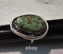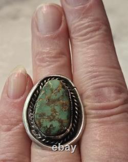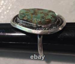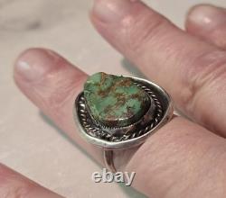 This lovely ring is a large, Navajo, hand-made sterling and bluish green turquoise, made by one of the most famous Navajo silversmiths, Gilbert Damon. The ring is signed but hard to see. The ring is size 7 1/4 and is sizable. You don't see many of his original old pieces anymore. The top of the ring measures approximately.