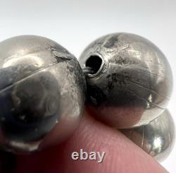 This is a beautiful and unique Navajo pearl necklace made of heavy, probably coin silver or lower grade silver beads. The necklace is 25 inches long and weighs 164 grams. It features a newer toggle closure. Looks like it was restrung in the 90s. The beads are much older.