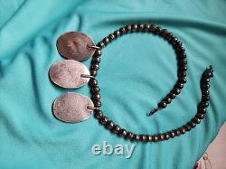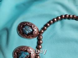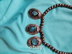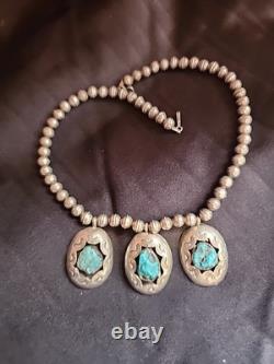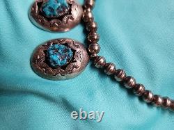 Early Vintage Navajo Turquoise Sterling Silver Necklace is a stunning piece of jewelry that showcases the beauty of Native American culture. The necklace features a teardrop-shaped pendant made of turquoise and sterling silver, with a hook closure.