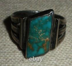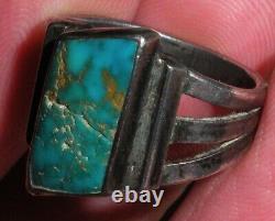 BAGUE EN ARGENT STERLING VINTAGE DES PREMIERS NAVAJO AVEC UNE GRANDE TURQUOISE BLEUE, TAILLE 7 1/4. LARGEUR MAXIMALE DE 1 POUCE. PONDÉRÉE À 5,4 GRAMS. QUELQUES LÉGERS SIGNES D'USURE EN RAISON DE L'AGE ET DE L'UTILISATION. IL Y A UNE FINE FISSURE LE LONG DE LA MATRICE DE LA PIERRE. TOUT EST STABLE ET PORTABLE. VOIR LES PHOTOS POUR PLUS DE DÉTAILS.
