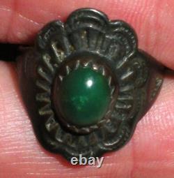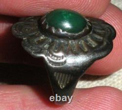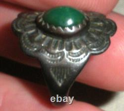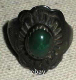 BAGUE EN ARGENT STERLING AVEC CONCHO ENSTAMPILLÉ VINTAGE NAVAJO EN TURQUOISE VERTE. 13/16 POUCES DE LARGE AU POINT LE PLUS LARGE. QUELQUES SIGNES D'USURE DUE À L'AGE ET À L'UTILISATION. TRÈS TACHÉE MAIS JE NE POLIS JAMAIS MOI-MÊME. VOIR LES PHOTOS POUR PLUS DE DÉTAILS.