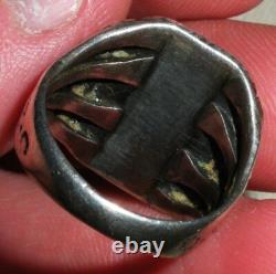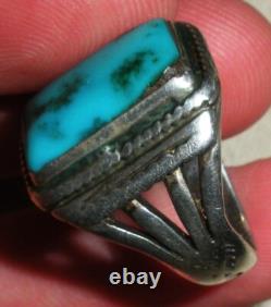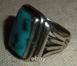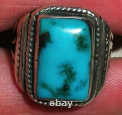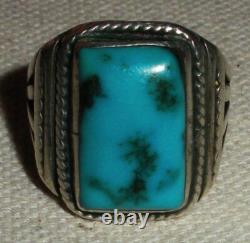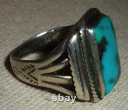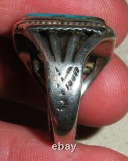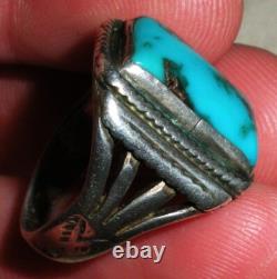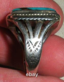 BAGUE VINTAGE NAVAJO DES ANNÉES 70 EN ARGENT STERLING AVEC DE LA TURQUOISE BLEUE. TRÈS BEAU TRAVAIL DE TAMPOGRAPHIE. LA MATRICE RESSEMBLE À UN VISAGE SOURIANT.