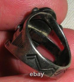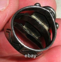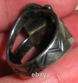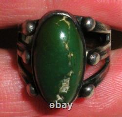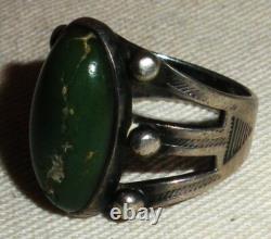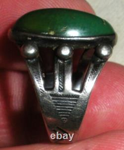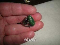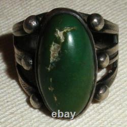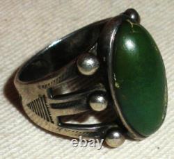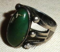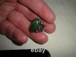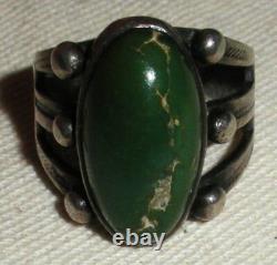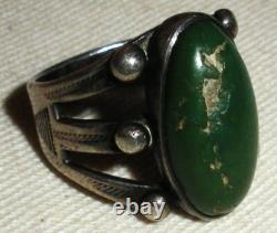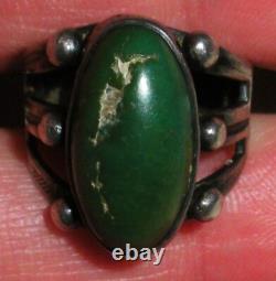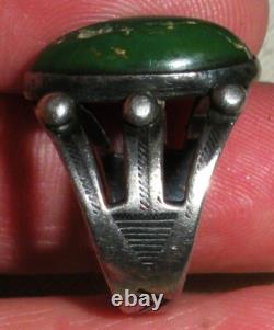 BAGUE EN ARGENT STERLING VINTAGE DES NAVAJO AVEC UNE GRANDE TURQUOISE VERTE, TAILLE 6. LARGEUR DE 3/4 POUCE AU POINT LE PLUS LARGE. QUELQUES SIGNES D'USURE LÉGERS EN RAISON DE L'AGE ET DE L'UTILISATION. VOIR LES PHOTOS POUR PLUS DE DÉTAILS.