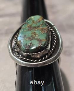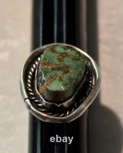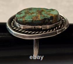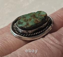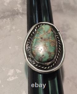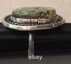 Le dessus de la bague mesure environ 78 mm de hauteur, environ 48 mm de largeur, et environ. La turquoise est profondément sertie en cabochon et entourée d'une bande torsadée en argent sterling, avec un bord surélevé. La bague nécessite un nettoyage.