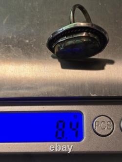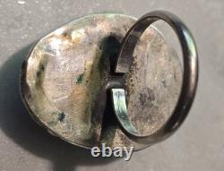 Cette belle bague est une grande bague Navajo, fabriquée à la main en argent sterling et en turquoise bleu-vert, réalisée par l'un des joailliers Navajo les plus célèbres, Gilbert Damon. La bague est signée mais difficile à voir.