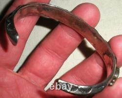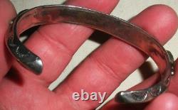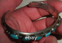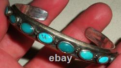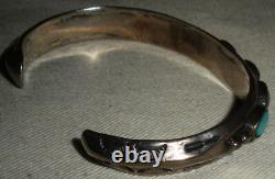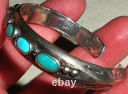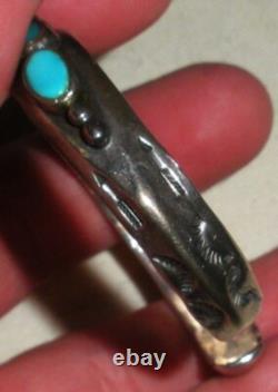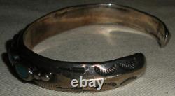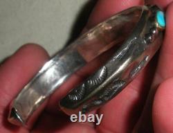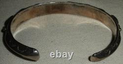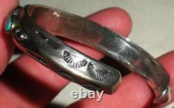 BRACELET ANTIQUE DES ANS EARLY NAVAJO EN ARGENT COIN TURQUOISE AVEC DES TAMPOGRAPHIES DE FLÈCHE. LARGEUR DE 3/8 POUCES (À LA PARTIE LA PLUS LARGE). LA CIRCONFÉRENCE DE L'EXTRÉMITÉ À L'EXTRÉMITÉ EST DE 5 3/4 POUCES. L'OUVERTURE EST DE 1 1/16 POUCES SUPPLÉMENTAIRES.