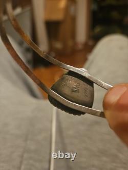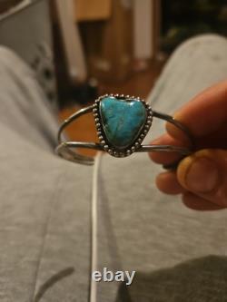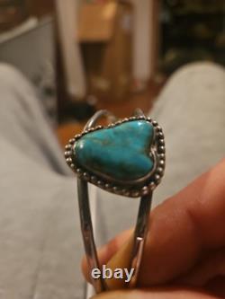 Ce bracelet époustouflant est une belle représentation de la culture et de l'artisanat navajo. Le design complexe du travail de tampons et les accents carinés mettent en valeur l'habileté experte des artisans amérindiens. Le bracelet présente une magnifique pierre de turquoise bleue, ajoutant une touche d'élégance à n'importe quelle tenue. La marque de cette pièce est amérindienne, et elle appartient aux catégories Bijoux & Montres, Ethnique, Régional & Tribal, et Bracelets & Charms.