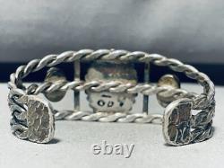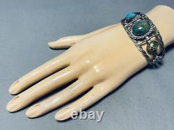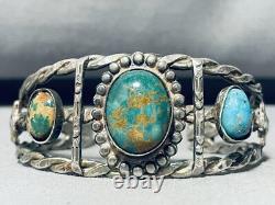 Ce magnifique bracelet contient trois belles pierres en turquoise en forme de dôme. Les pierres semblent provenir de la mine de turquoise Royston et de la mine de turquoise Blue Gem. Entourant la pierre centrale se trouvent d'éblouissantes gouttes d'argent. De chaque côté de la pierre centrale se trouvent de magnifiques flancs en argent long estampé. Situés aux extrémités du bracelet, il y a de superbes flancs en argent en forme d'oiseau tonnerre sculptés à la main. Le bracelet contient un magnifique bracelet en argent triple, solide et épais, qui s'élargit vers le centre. Chacun des shanks en argent est magnifiquement enroulé d'une extrémité à l'autre.La pierre centrale mesure environ 3/4" x 1/2". La largeur du bracelet mesure environ 1-1/8. Début à milieu du siècle. La mesure de l'intérieur d'une extrémité à l'autre est d'environ 5-1/2" avec un écart supplémentaire de 1".