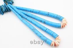 Ajoutant à son charme, deux brins de pendentif Jacla, soigneusement réalisés avec des perles heishi en turquoise et ornés d'un point focal de perles d'huître épineuse au centre, créant un mélange harmonieux de couleurs et de textures. En tant que pièce de vieux prêt, elle porte les murmures des générations passées, imprégnée de patrimoine culturel et de tradition. Malgré son âge, la pièce se vante d'une finition captivante ternie et patinée, ajoutant à son attrait et à son charme vintage. Pesant 230 grammes et mesurant 30 pouces de long, avec le Jacla s'étendant jusqu'à 5 1/2 pouces, chaque détail de ce collier témoigne de l'habileté et de l'art de son créateur.Des perles impressionnantes de 18 mm aux délicates de 8 mm, chaque élément est un témoignage de la maîtrise de l'artisan navajo et de la beauté durable de l'artisanat de bijoux amérindiens. **LAYAWAY** : Découvrez la commodité de notre option de mise de côté ! Le non-respect de la date limite peut entraîner l'annulation de l'accord de mise de côté. Si vous rencontrez un problème avec l'article à sa réception, veuillez nous le faire savoir immédiatement.