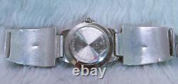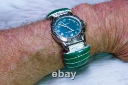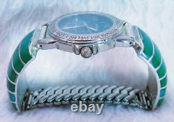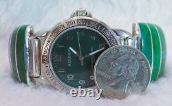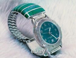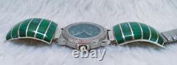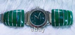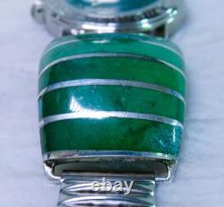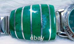 Les extrémités de la montre sont fabriquées en argent sterling. Chacune est une coulée très solide. Les 2 pointes pèsent 58 grammes au total. Elles mesurent 1-7/8" de longueur x 1-3/16" au plus large. Je ne sais pas ce que c'est l'incrustation verte. Je sais cependant qu'il y a 5 endroits qui se sont détériorés et ont été parfaitement remplis avec de la turquoise en incrustation. La montre est un quartz de Merona. Elle est en acier inoxydable avec un cadran vert. Elle garde un temps parfait. Une nouvelle batterie a été installée ce jour.